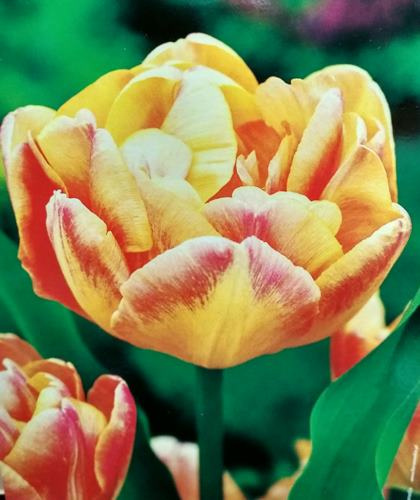 Komplet 10 cebulek pięknego tulipana o dużych pełnych kwiatach. Kwiaty przypominają kształt kwiaty piwonii, są słodko pachnące. Odmiana przez wzgląd na swój nieduży rozmiar ok.40-50 cm jest bezkonkurencyjna do sadzenia w pojemnikach. Kwiaty są mieszanką trzech kolorów różu, morelowego i pomarańczu ze szczyptą zieleni i kwitną w kwietniu. Polecany na kwiat cięty, na rabaty, obwódki i do ogrodów skalnych, a także do uprawy w pojemnikach na tarasach i balkonach.